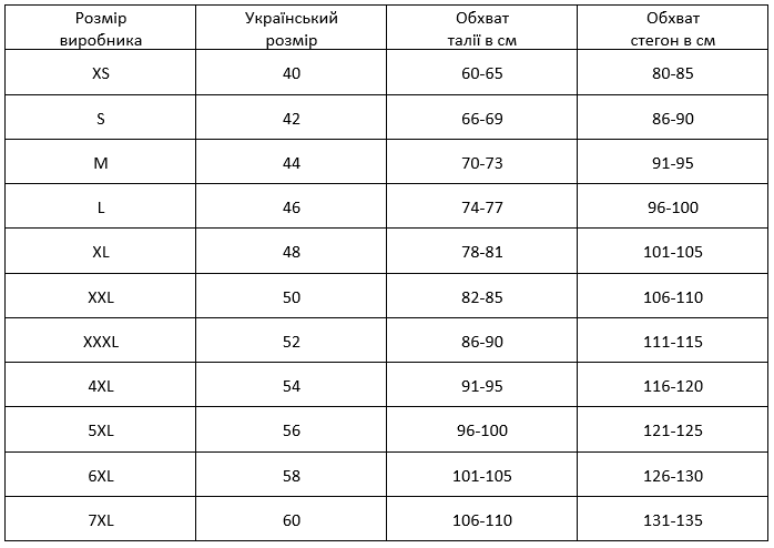 Таблиця розмірів